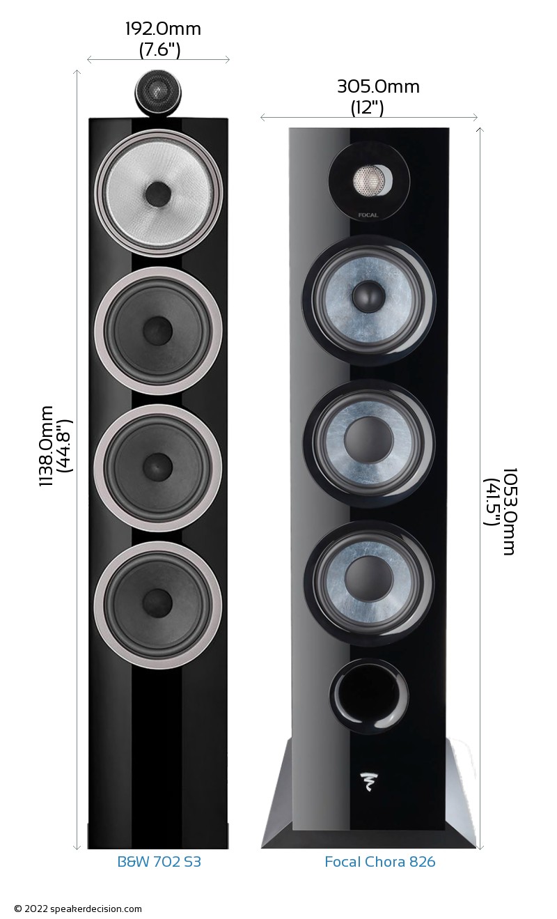 B&W 702 S3 is 113mm narrower and 13mm less deeper than Focal Chora 826 but it is also 85mm taller.