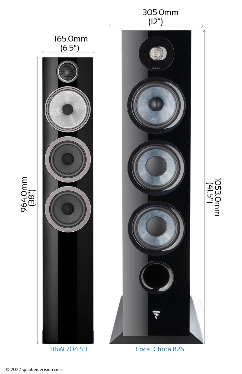 Size of a speaker can sometimes become an important decision factor due to space constraints or in some cases purely for esthetic reasons. In this section, we are going to compare B&W 704 S3's and Focal Chora 826's external dimensions. B&W 704 S3 has external dimensions of 964.0 x 165.0 x 300.0mm ( 38-inch x 6.5-inch x 11.8-inch) whereas Focal Chora 826 has external dimensions of 1053.0 x 305.0 x 404.0mm ( 41-1/2 x 12 x 15-7/8inch) .