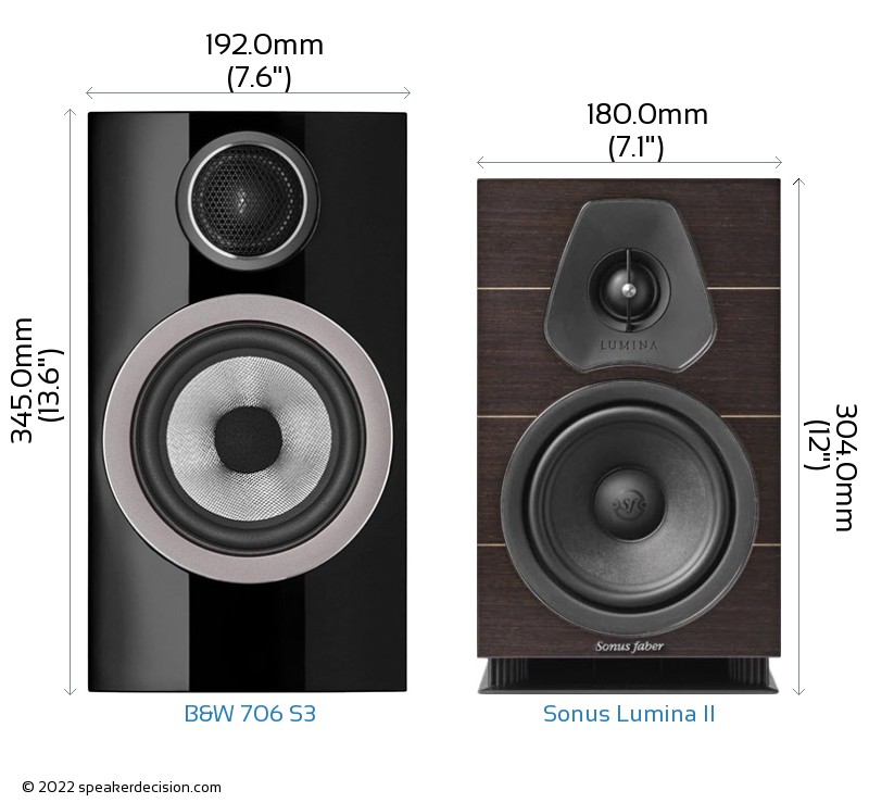 Size of a speaker can sometimes become an important decision factor due to space constraints or in some cases purely for esthetic reasons. In this section, we are going to compare B&W 706 S3's and Sonus Lumina II's external dimensions. B&W 706 S3 has external dimensions of 345.0 x 192.0 x 334.0mm ( 13.6-inch x 7.6-inch x 13.1-inch) whereas Sonus Lumina II has external dimensions of 304.0 x 180.0 x 263.0mm ( 12 x 7.1 x 10.3inch) .