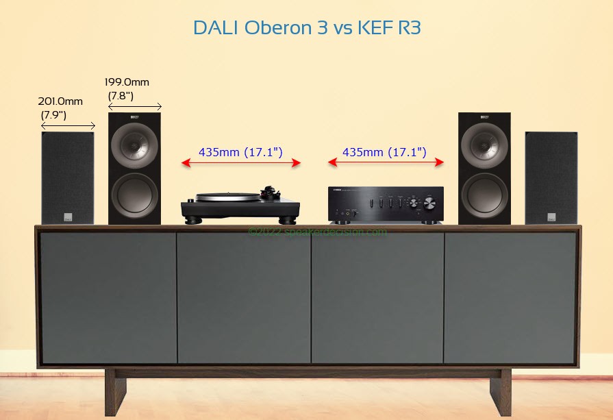 DALI Oberon 3 is 73mm shorter and 27mm less deeper than KEF R3 but it is also 2mm wider.