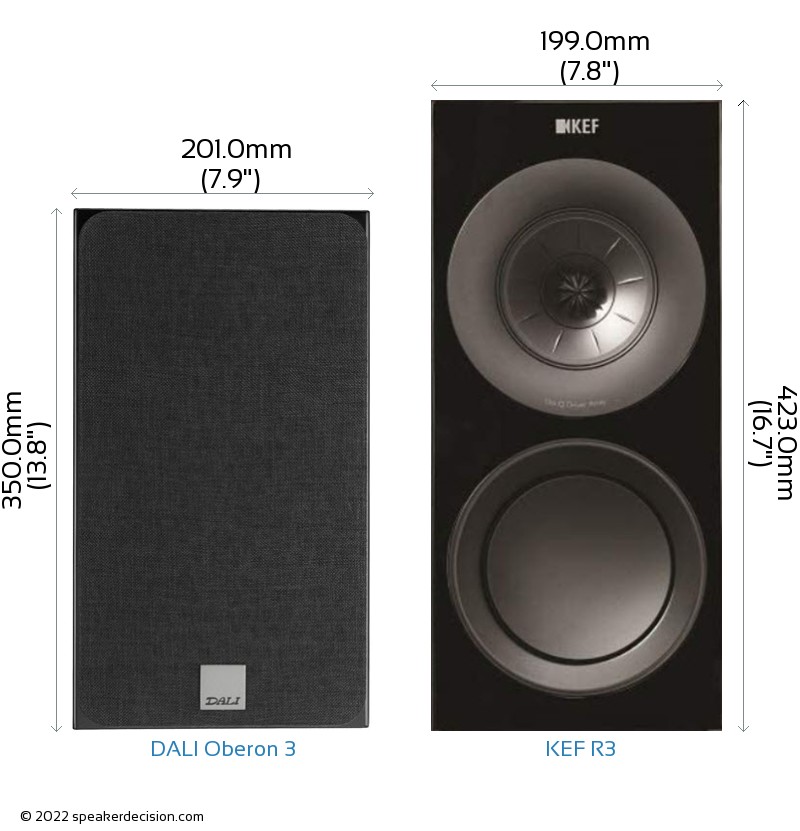 Size of a speaker can sometimes become an important decision factor due to space constraints or in some cases purely for esthetic reasons. In this section, we are going to compare DALI Oberon 3's and KEF R3's external dimensions. DALI Oberon 3 has external dimensions of 350.0 x 201.0 x 310.0mm ( 13-3/4 x 7-7/8 x 12-3/16inch) whereas KEF R3 has external dimensions of 423.0 x 199.0 x 337.0mm ( 16-5/8 x 7-13/16 x 13-1/4inch) .