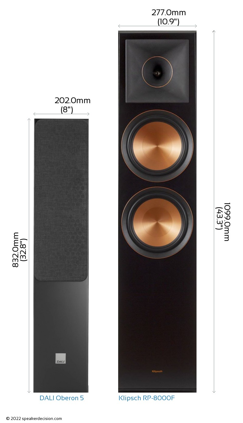 Size of a speaker can sometimes become an important decision factor due to space constraints or in some cases purely for esthetic reasons. In this section, we are going to compare DALI Oberon 5's and Klipsch RP-8000F's external dimensions. DALI Oberon 5 has external dimensions of 832.0 x 202.0 x 277.0mm ( 32-3/4 x 7-15/16 x 10-7/8inch) whereas Klipsch RP-8000F has external dimensions of 1099.0 x 277.0 x 445.0mm ( 43-1/4 x 10-7/8 x 17-1/2inch) .
