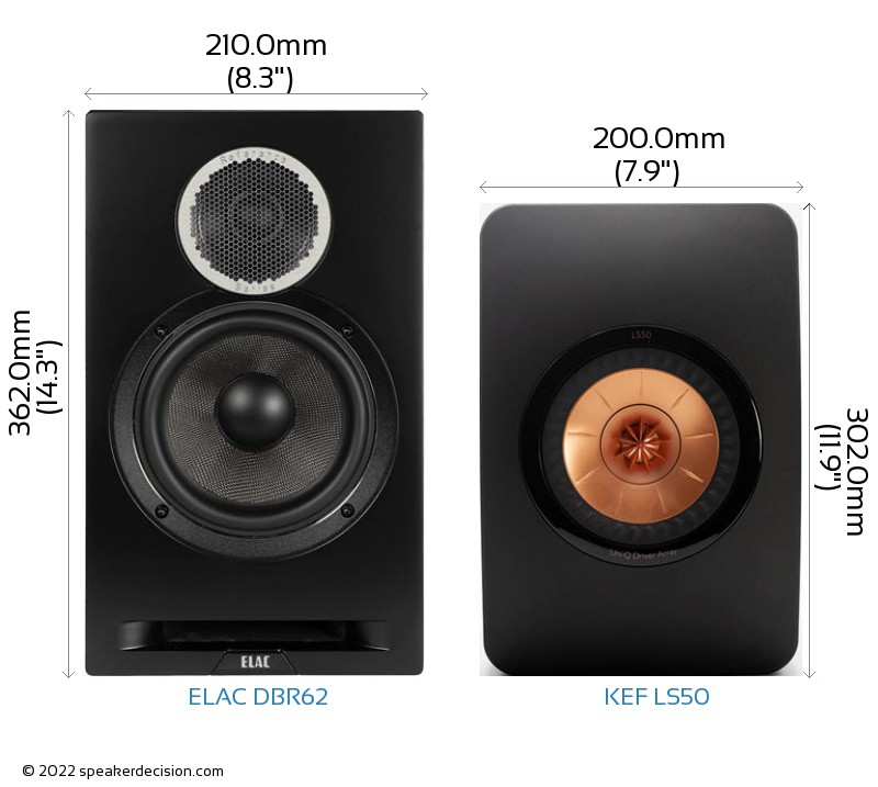 KEF LS50 is 10mm narrower and 60mm shorter than ELAC Debut Ref DBR62 but it is also 1mm deeper.