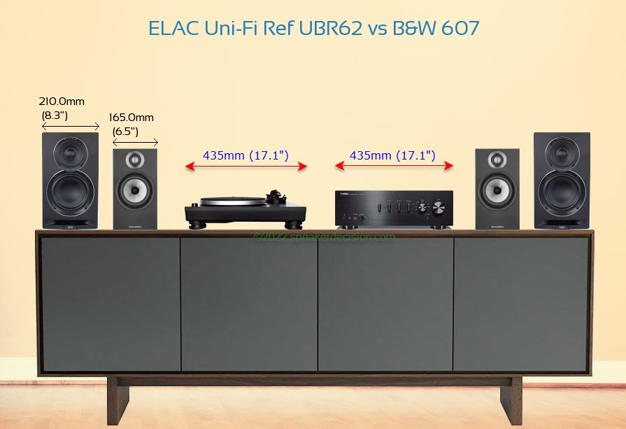 Size Comparison image of ELAC Uni-Fi Ref UBR62 and B&W 607 on a Media Console