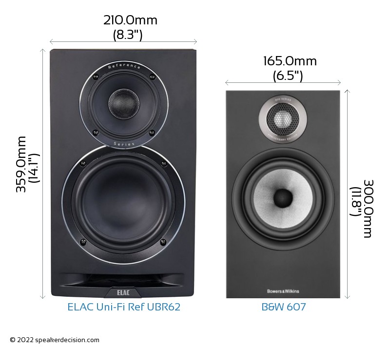 Size of a speaker can sometimes become an important decision factor due to space constraints or in some cases purely for esthetic reasons. In this section, we are going to compare ELAC Uni-Fi Ref UBR62's and B&W 607's external dimensions. ELAC Uni-Fi Ref UBR62 has external dimensions of 359.0 x 210.0 x 332.0mm ( 14-1/8 x 8-1/4 x 13-1/16inch) whereas B&W 607 has external dimensions of 300.0 x 165.0 x 207.0mm ( 11.8 x 6.4 x 8.1inch) .
