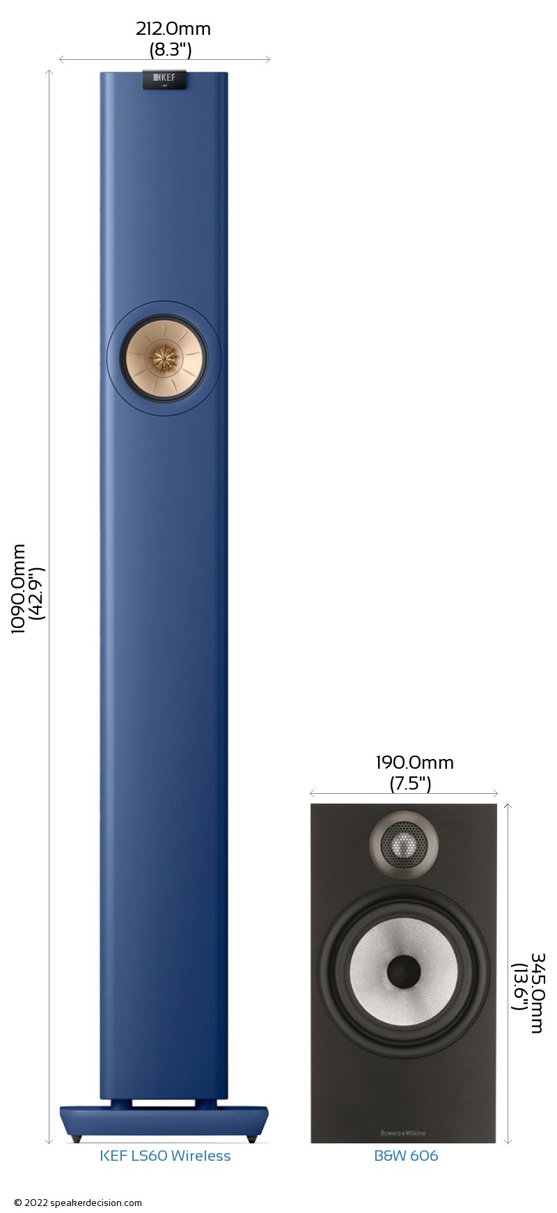 Size of a speaker can sometimes become an important decision factor due to space constraints or in some cases purely for esthetic reasons. In this section, we are going to compare KEF LS60 Wireless's and B&W 606's external dimensions. KEF LS60 Wireless has external dimensions of 1090.0 x 212.0 x 394.0mm ( 42.9 x 8.3 x 15.5inch) whereas B&W 606 has external dimensions of 345.0 x 190.0 x 324.0mm ( 13.5 x 7.4 x 12.7inch) .