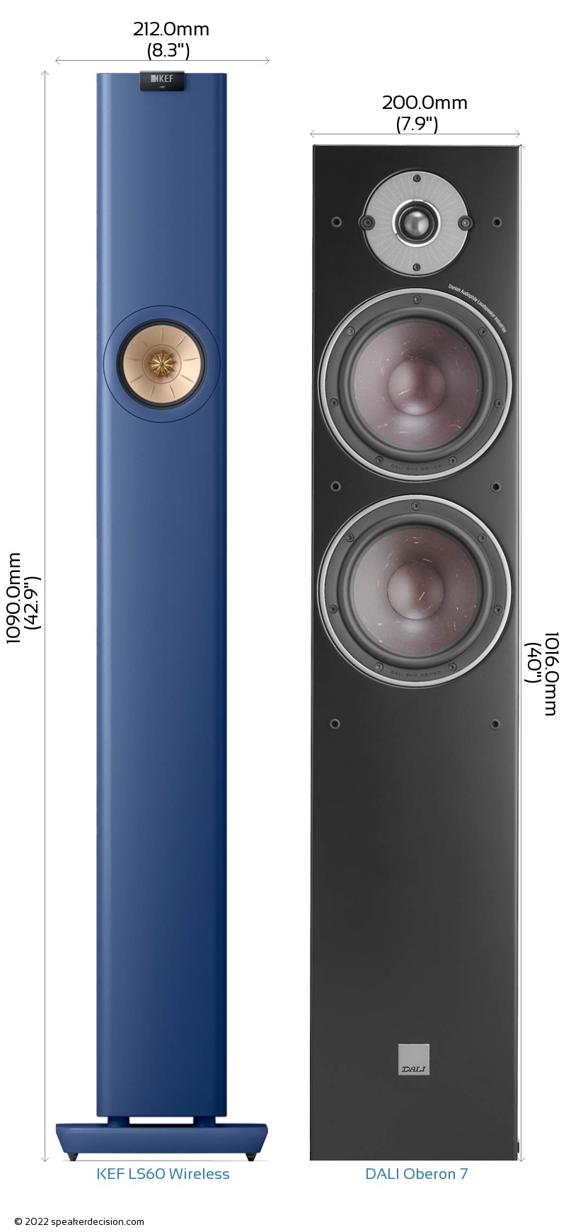 Comparison image of KEF LS60 Wireless and DALI Oberon 7 Size and External Dimensions