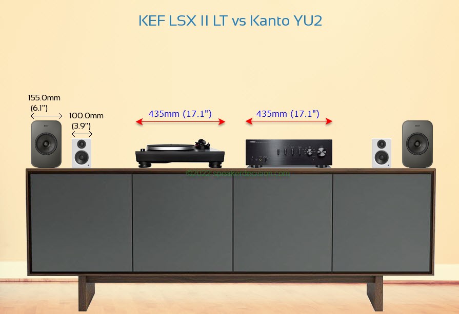 Size Comparison image of KEF LSX II LT and Kanto YU2 on a Media Console