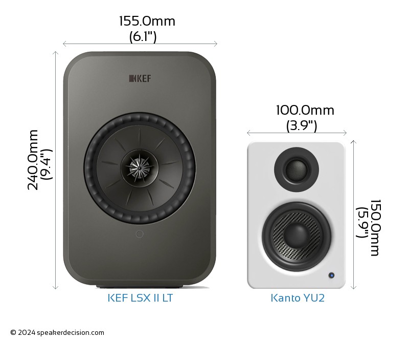 KEF LSX II LT is clearly the larger of the two speakers. Its body is 55mm wider, 90mm taller and 45mm deeper than Kanto YU2.