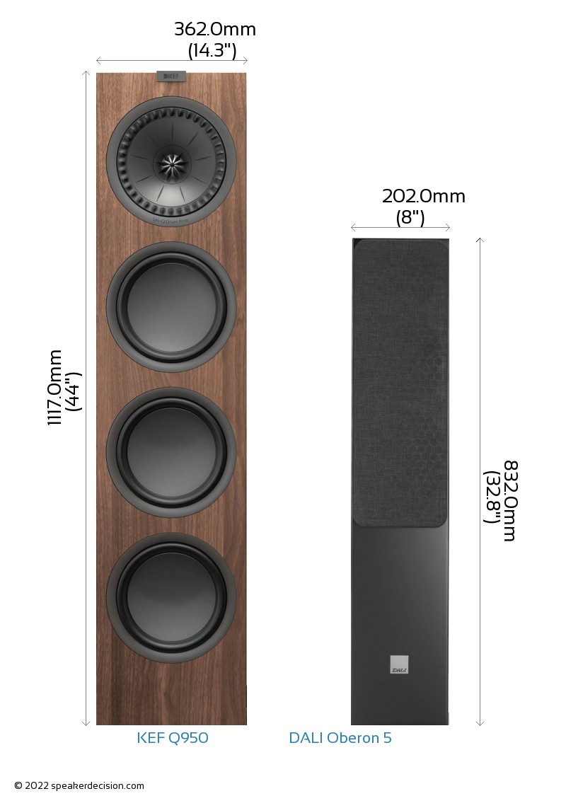 Size of a speaker can sometimes become an important decision factor due to space constraints or in some cases purely for esthetic reasons. In this section, we are going to compare KEF Q950's and DALI Oberon 5's external dimensions. KEF Q950 has external dimensions of 1117.0 x 362.0 x 315.0mm ( 43-15/16 x 14-1/4 x 12-3/8inch) whereas DALI Oberon 5 has external dimensions of 832.0 x 202.0 x 277.0mm ( 32-3/4 x 7-15/16 x 10-7/8inch) .