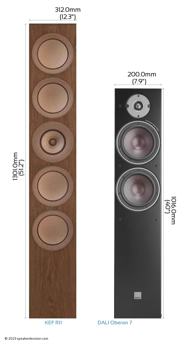 Below you can see the front view size comparison of KEF R11 and DALI Oberon 7 in scale.