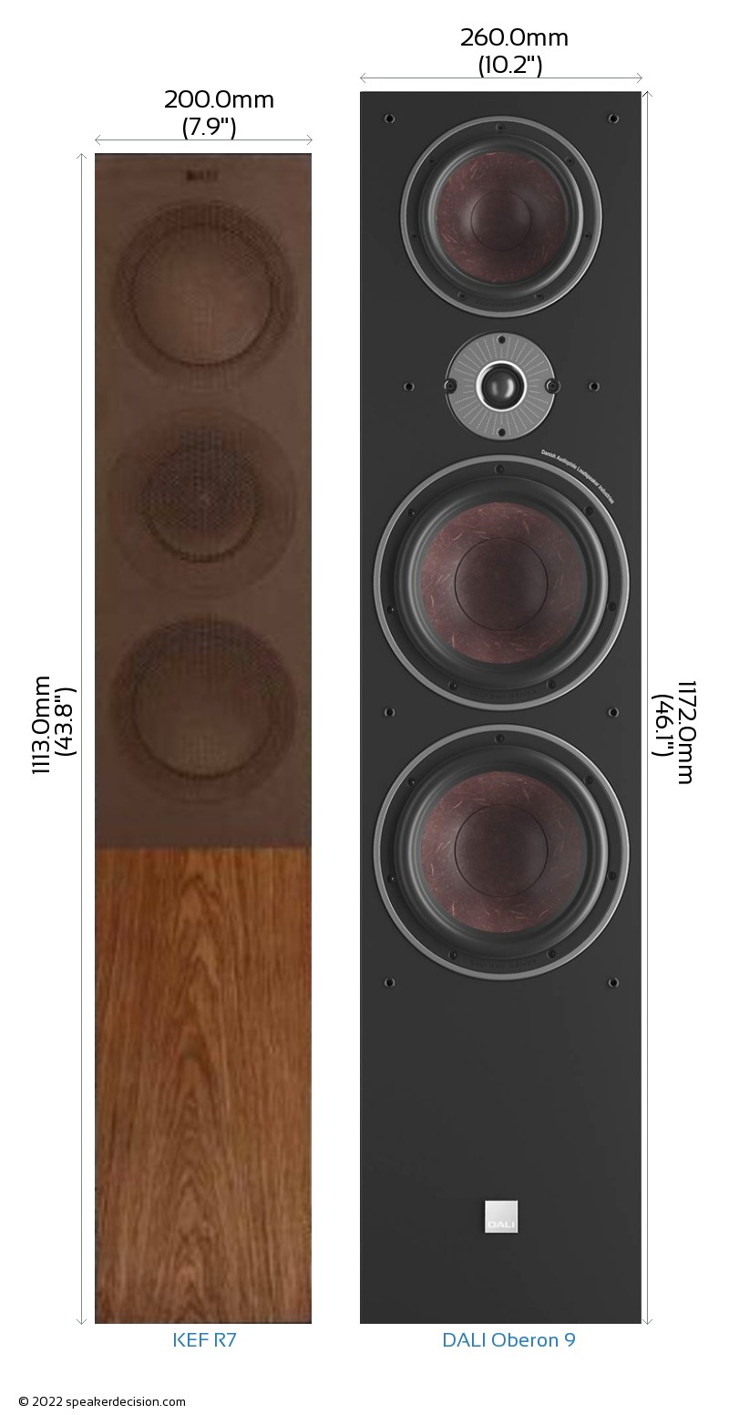 Size of a speaker can sometimes become an important decision factor due to space constraints or in some cases purely for esthetic reasons. In this section, we are going to compare KEF R7's and DALI Oberon 9's external dimensions. KEF R7 has external dimensions of 1113.0 x 200.0 x 389.0mm ( 43-13/16 x 8 x 15-5/16inch) whereas DALI Oberon 9 has external dimensions of 1172.0 x 260.0 x 407.0mm ( 46-1/8 x 10-1/4 x 16inch) .