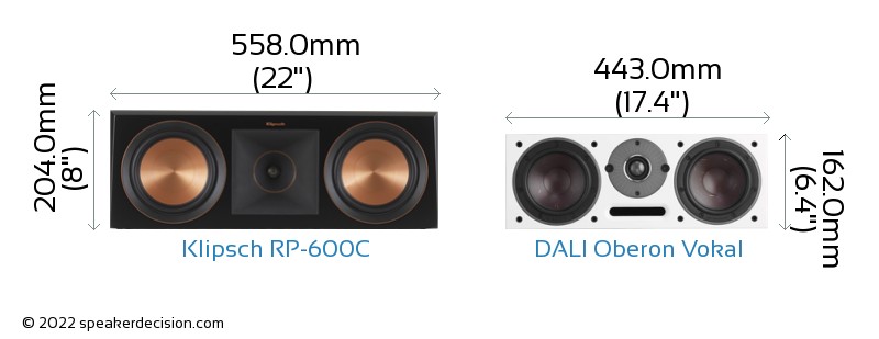 Size of a speaker can sometimes become an important decision factor due to space constraints or in some cases purely for esthetic reasons. In this section, we are going to compare Klipsch RP-600C's and DALI Oberon Vokal's external dimensions. Klipsch RP-600C has external dimensions of 204.0 x 558.0 x 308.0mm ( 8 x 21-15/16 x 12-1/8inch) whereas DALI Oberon Vokal has external dimensions of 162.0 x 443.0 x 294.0mm ( 6-3/8 x 17-7/16 x 11-9/16inch) .