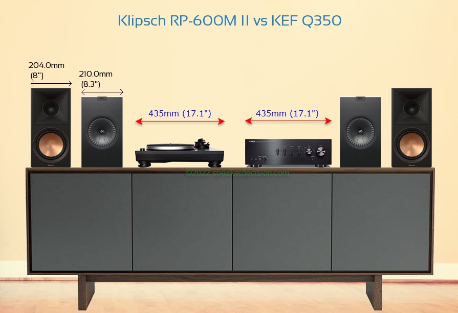 KEF Q350 is 44mm shorter and 26mm less deeper than Klipsch RP-600M II but it is also 6mm wider.