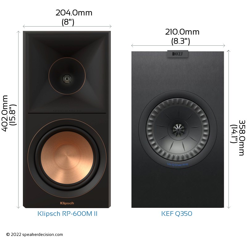 Size of a speaker can sometimes become an important decision factor due to space constraints or in some cases purely for esthetic reasons. In this section, we are going to compare Klipsch RP-600M II's and KEF Q350's external dimensions. Klipsch RP-600M II has external dimensions of 402.0 x 204.0 x 332.0mm ( 15-13/16 x 8 x 13-1/16inch) whereas KEF Q350 has external dimensions of 358.0 x 210.0 x 306.0mm ( 14.0 x 8.2 x 12.0inch) .