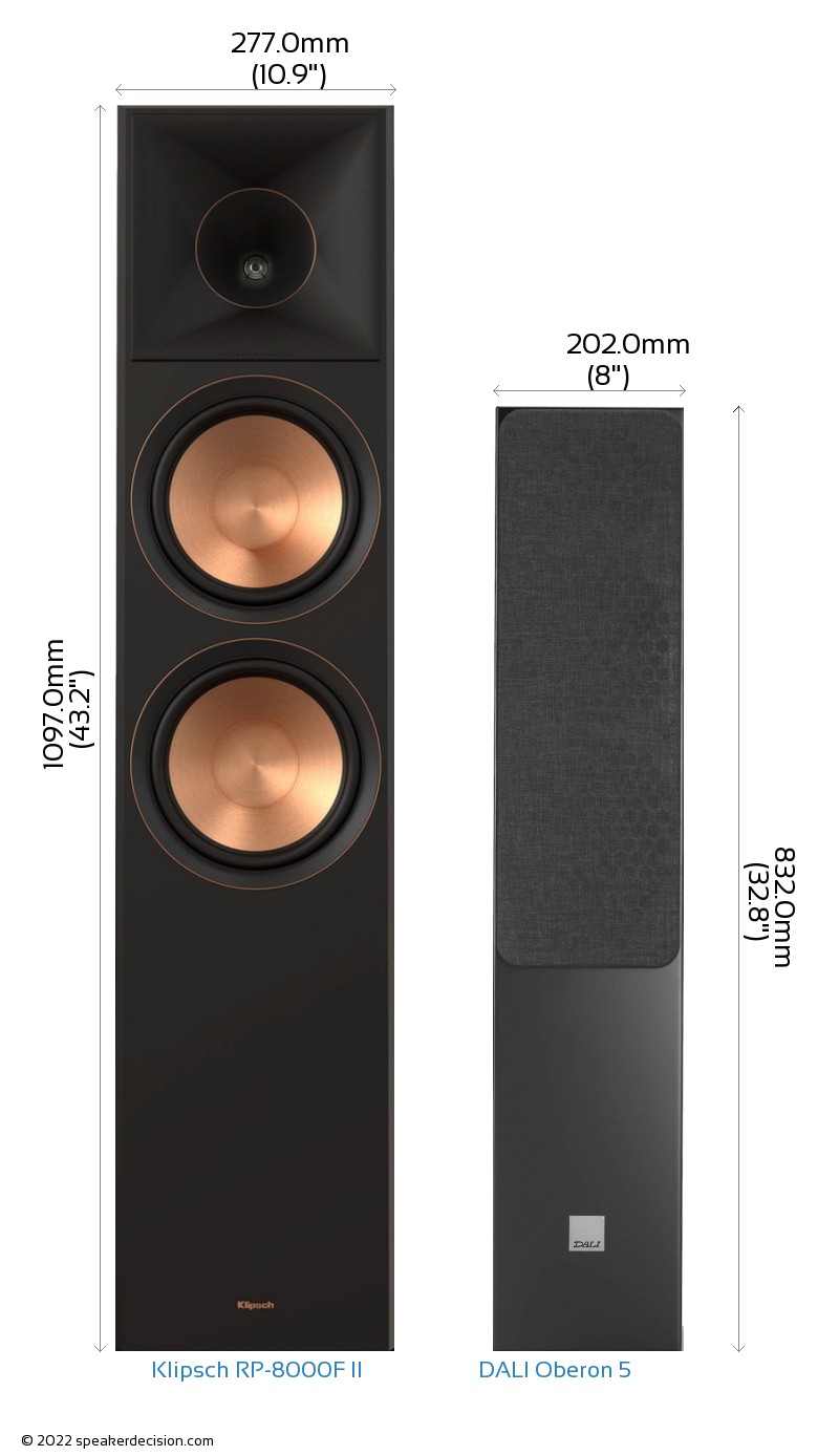 Size of a speaker can sometimes become an important decision factor due to space constraints or in some cases purely for esthetic reasons. In this section, we are going to compare Klipsch RP-8000F II's and DALI Oberon 5's external dimensions. Klipsch RP-8000F II has external dimensions of 1097.0 x 277.0 x 447.0mm ( 43-3/16 x 10-7/8 x 17-9/16inch) whereas DALI Oberon 5 has external dimensions of 832.0 x 202.0 x 277.0mm ( 32-3/4 x 7-15/16 x 10-7/8inch) .