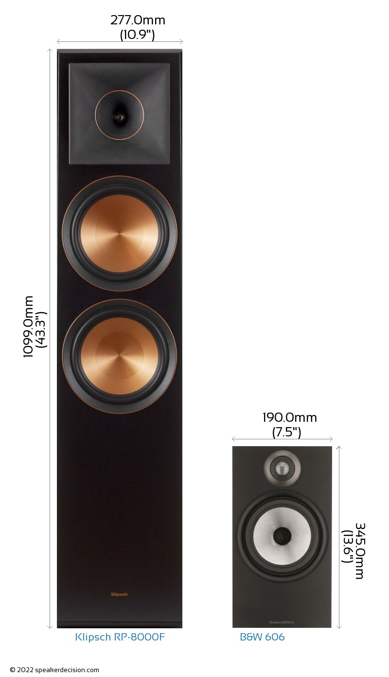 Comparison image of Klipsch RP-8000F and B&W 606 Size and External Dimensions