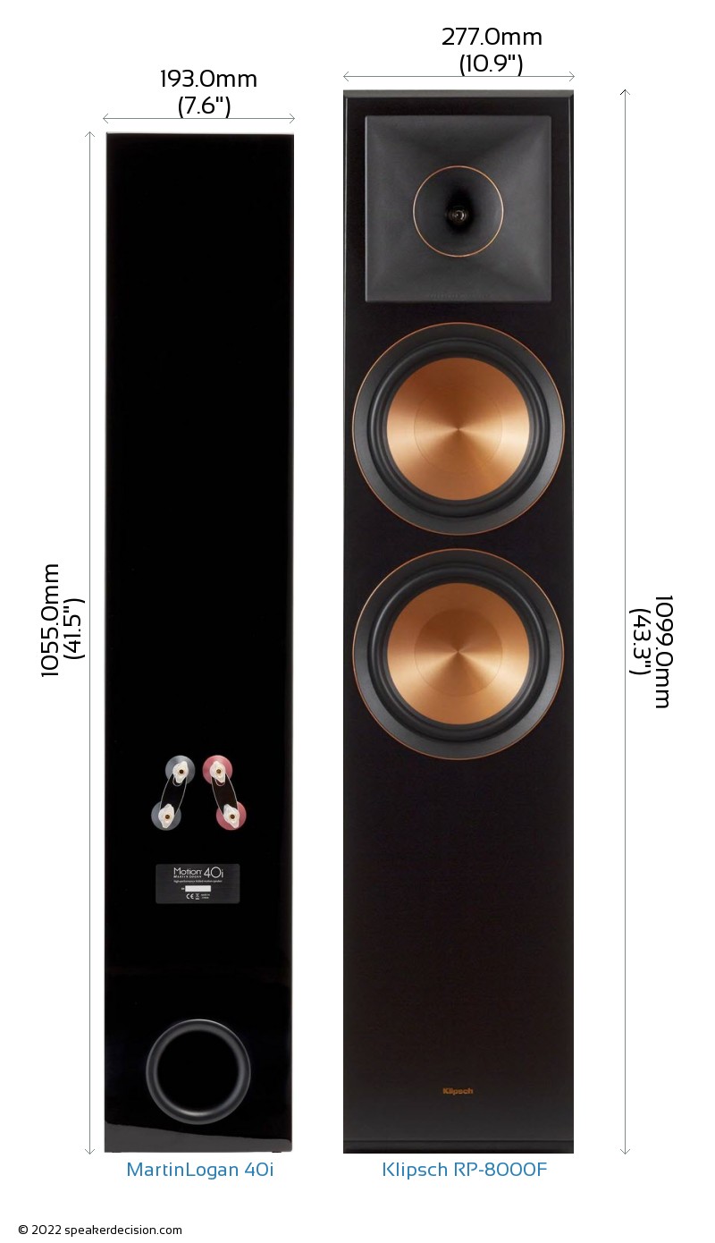 Size of a speaker can sometimes become an important decision factor due to space constraints or in some cases purely for esthetic reasons. In this section, we are going to compare MartinLogan 40i's and Klipsch RP-8000F's external dimensions. MartinLogan 40i has external dimensions of 1055.0 x 193.0 x 332.0mm ( 41-1/2 x 7-9/16 x 13-1/16inch) whereas Klipsch RP-8000F has external dimensions of 1099.0 x 277.0 x 445.0mm ( 43-1/4 x 10-7/8 x 17-1/2inch) .