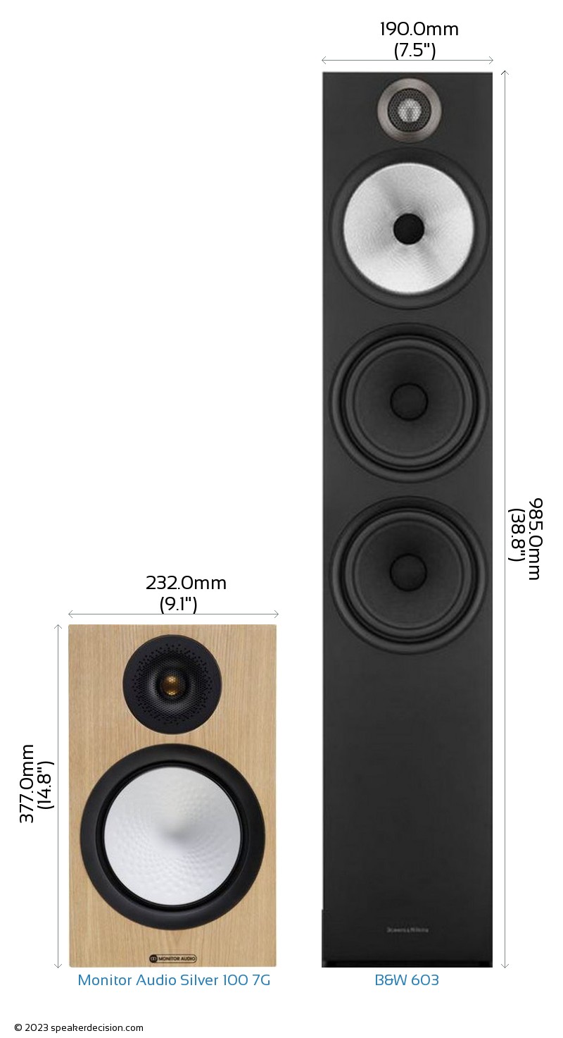 Size of a speaker can sometimes become an important decision factor due to space constraints or in some cases purely for esthetic reasons. In this section, we are going to compare Monitor Audio Silver 100 7G's and B&W 603's external dimensions. Monitor Audio Silver 100 7G has external dimensions of 377.0 x 232.0 x 332.0mm ( 14-13/16 x 9-1/8 x 13-1/16inch) whereas B&W 603 has external dimensions of 985.0 x 190.0 x 340.0mm ( 38.7 x 7.4 x 13.3inch) .
