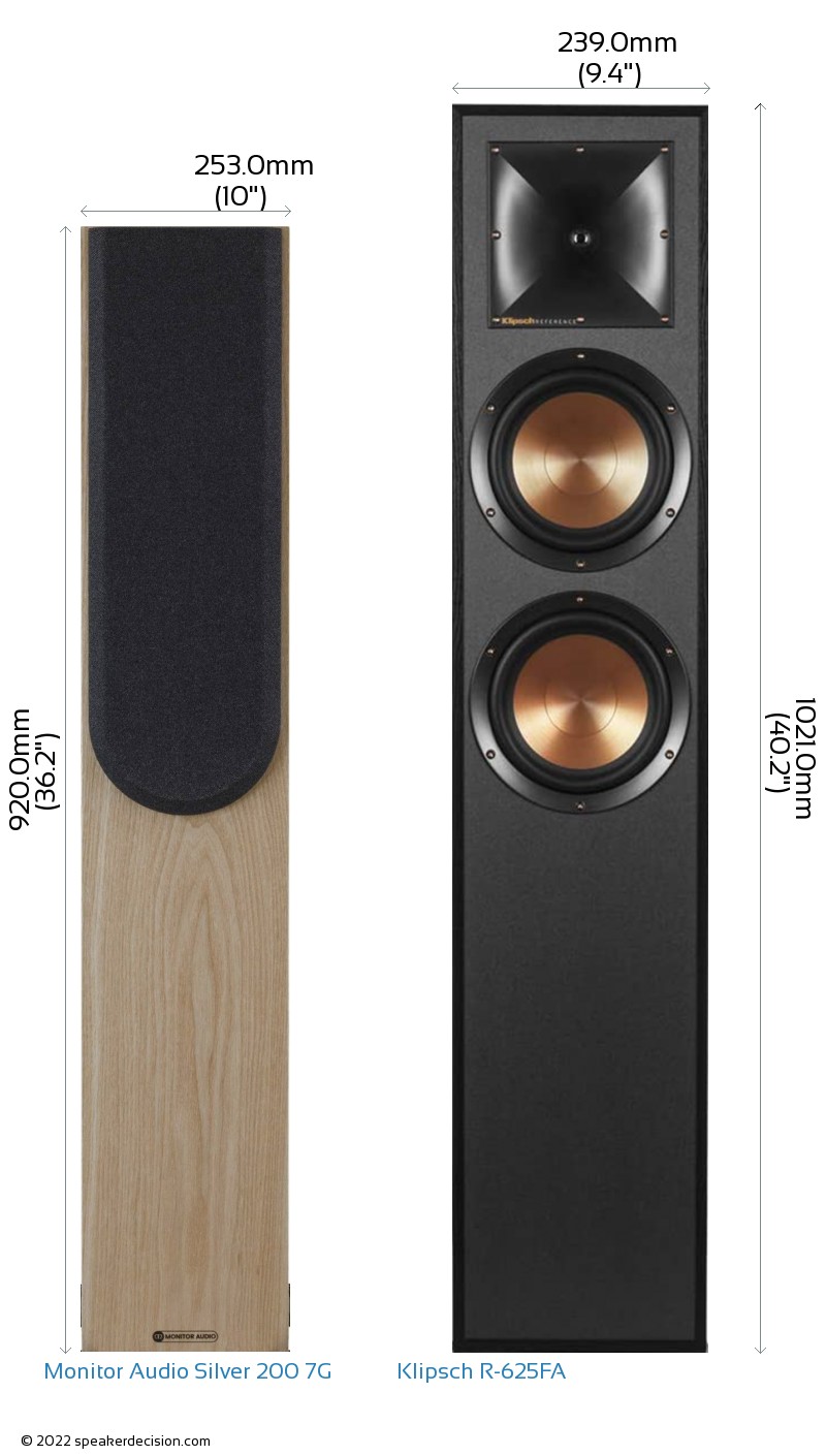 Comparison image of Monitor Audio Silver 200 7G and Klipsch R-625FA Size and External Dimensions