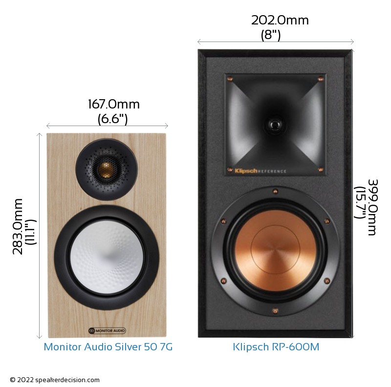 Size of a speaker can sometimes become an important decision factor due to space constraints or in some cases purely for esthetic reasons. In this section, we are going to compare Monitor Audio Silver 50 7G's and Klipsch RP-600M's external dimensions. Monitor Audio Silver 50 7G has external dimensions of 283.0 x 167.0 x 274.0mm ( 11-1/8 x 6-9/16 x 10-3/4inch) whereas Klipsch RP-600M has external dimensions of 399.0 x 202.0 x 301.0mm ( 15.7 x 7.9 x 11.8inch) .