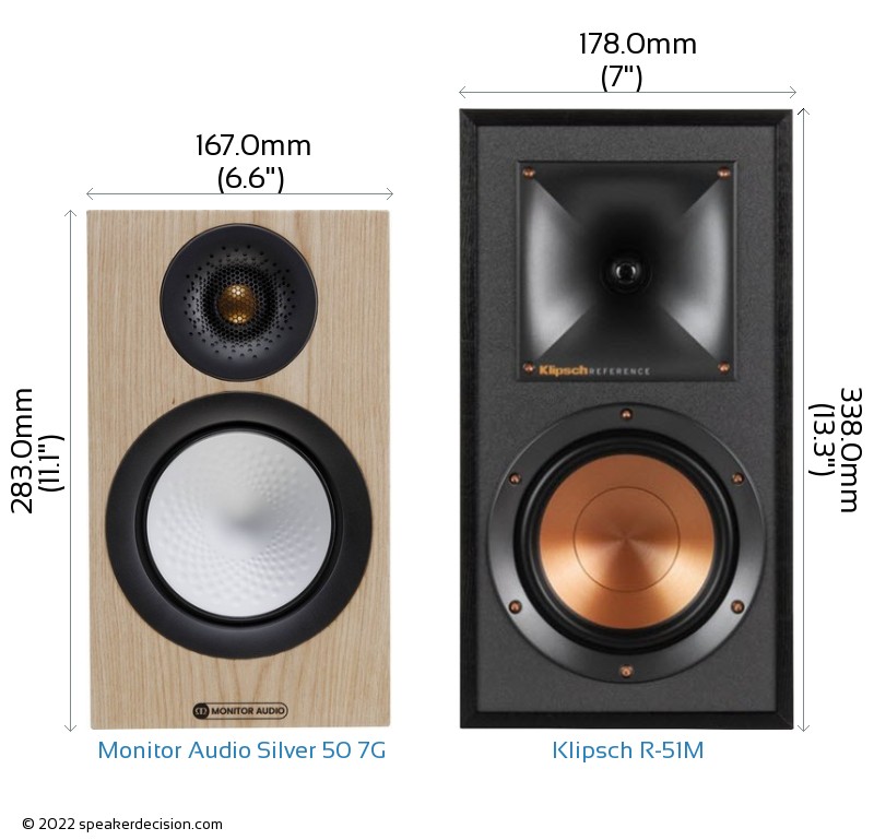 Monitor Audio Silver 50 7G is 11mm narrower and 55mm shorter than Klipsch R-51M but it is also 59mm deeper.
