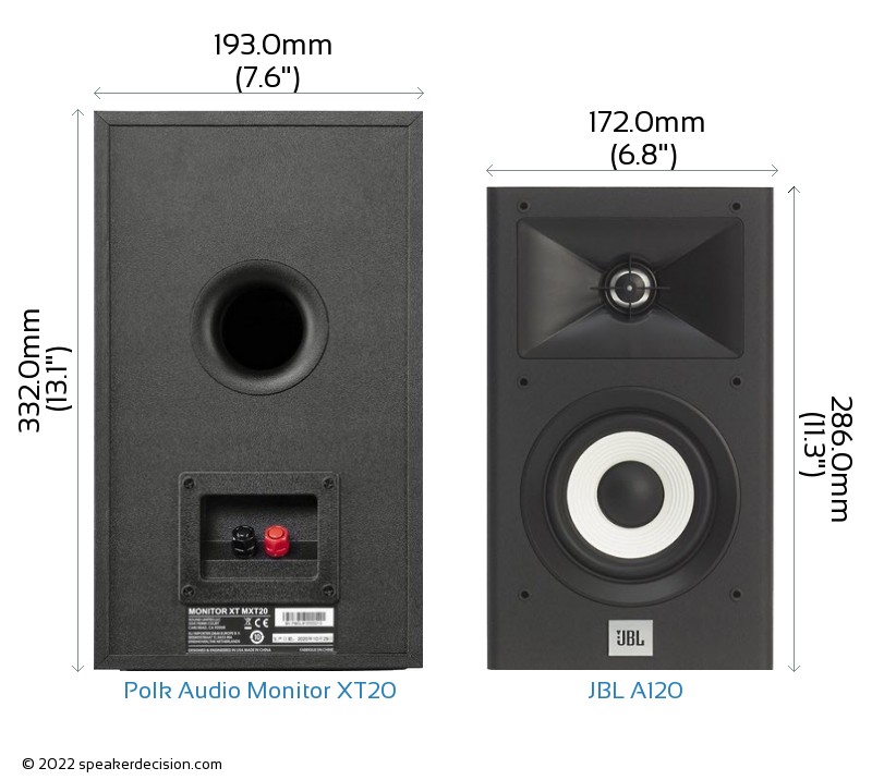 Comparison image of Polk XT20 and JBL A120 Size and External Dimensions