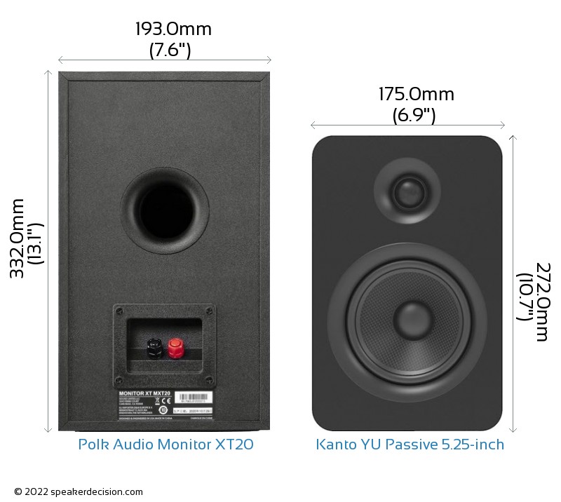 Size of a speaker can sometimes become an important decision factor due to space constraints or in some cases purely for esthetic reasons. In this section, we are going to compare Polk XT20's and Kanto YU Passive 5.25-inch's external dimensions. Polk XT20 has external dimensions of 332.0 x 193.0 x 281.0mm ( 13-1/16 x 7-9/16 x 11-1/16inch) whereas Kanto YU Passive 5.25-inch has external dimensions of 272.0 x 175.0 x 205.0mm ( 10.7 x 6.9 x 8.1inch) .