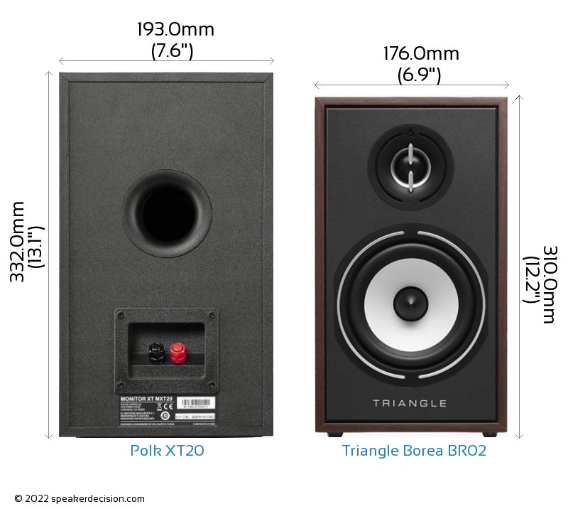 Weight Comparison The weight of a loudspeaker can become an important factor if you need to move and reposition the unit often. Weight of a speaker can also "sometimes" be an indicator of the rigidity of the enclosure and the quality of the internal components used. The Polk XT20 weighs 5.45kg / 12lbs and the Triangle Borea BR02 weighs 4.87kg / 10.7lbs. This makes the XT20 12% heavier than the Borea BR02.