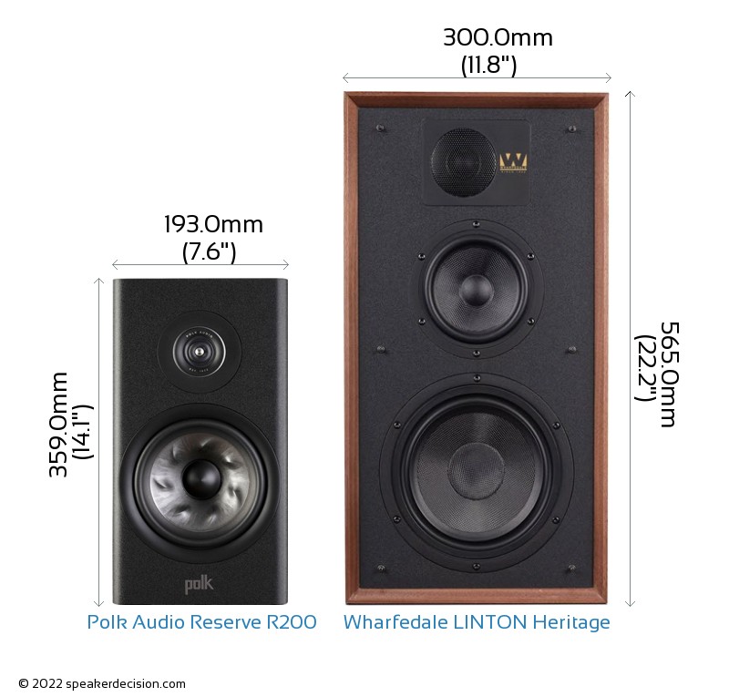Wharfedale LINTON is clearly the larger of the two speakers. Its body is 107mm wider, 206mm taller and 5mm deeper than Polk R200.