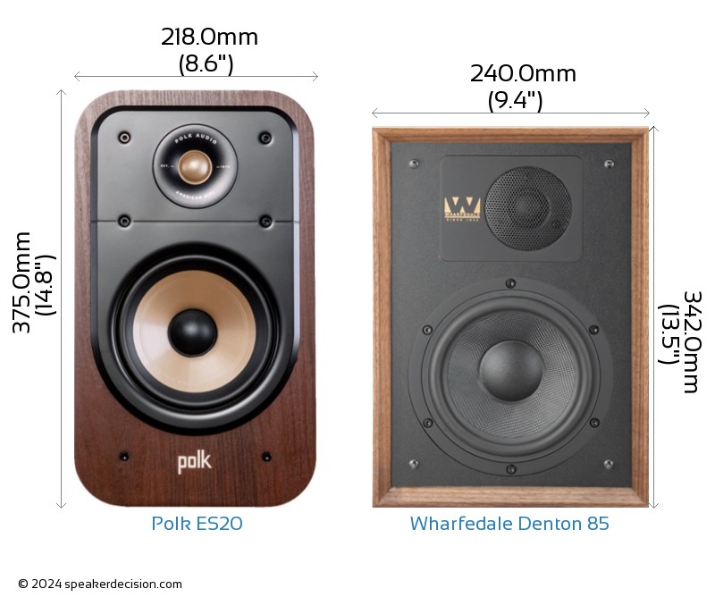 Wharfedale Denton 85 is 33mm shorter and 47mm less deeper than Polk ES20 but it is also 22mm wider.