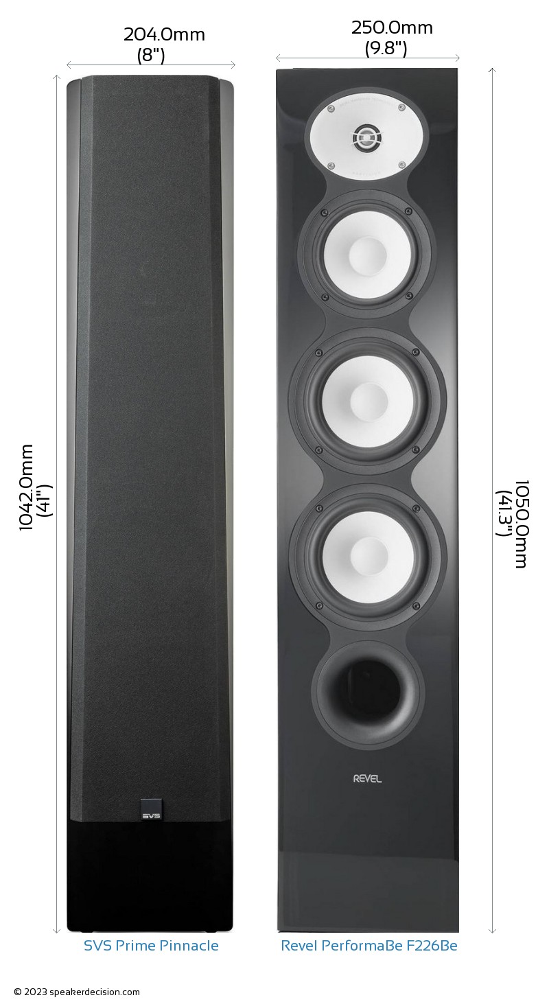 SVS Prime Pinnacle is 46mm narrower and 8mm shorter than Revel PerformaBe F226Be but it is also 5mm deeper.