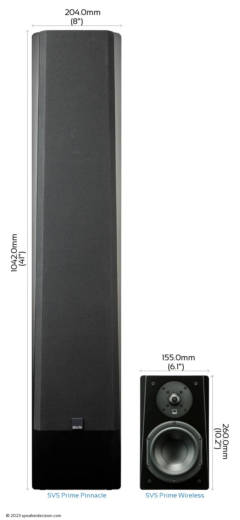 Comparison image of SVS Prime Pinnacle and SVS Prime Wireless Size and External Dimensions