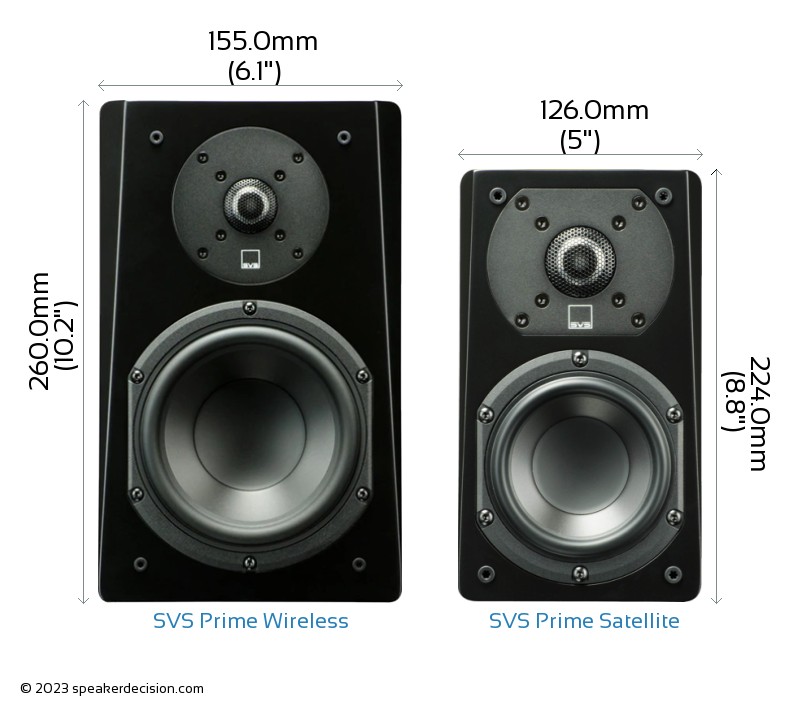 Comparison image of SVS Prime Wireless and SVS Prime Satellite Size and External Dimensions