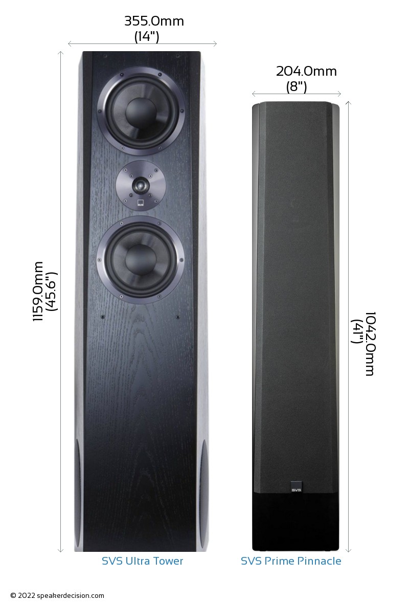 Size of a speaker can sometimes become an important decision factor due to space constraints or in some cases purely for esthetic reasons. In this section, we are going to compare SVS Ultra Tower's and SVS Prime Pinnacle's external dimensions. SVS Ultra Tower has external dimensions of 1159.0 x 355.0 x 445.0mm ( 45-5/8 x 13-15/16 x 17-1/2inch) whereas SVS Prime Pinnacle has external dimensions of 1042.0 x 204.0 x 355.0mm ( 41 x 8 x 13-15/16inch) .