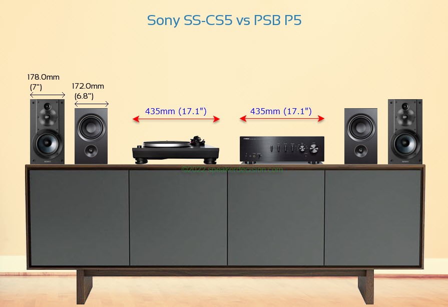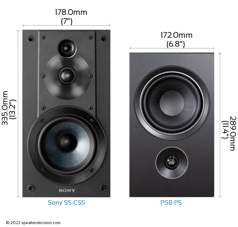 PSB P5 is 6mm narrower and 46mm shorter than Sony SS-CS5 but it is also 34mm deeper.
