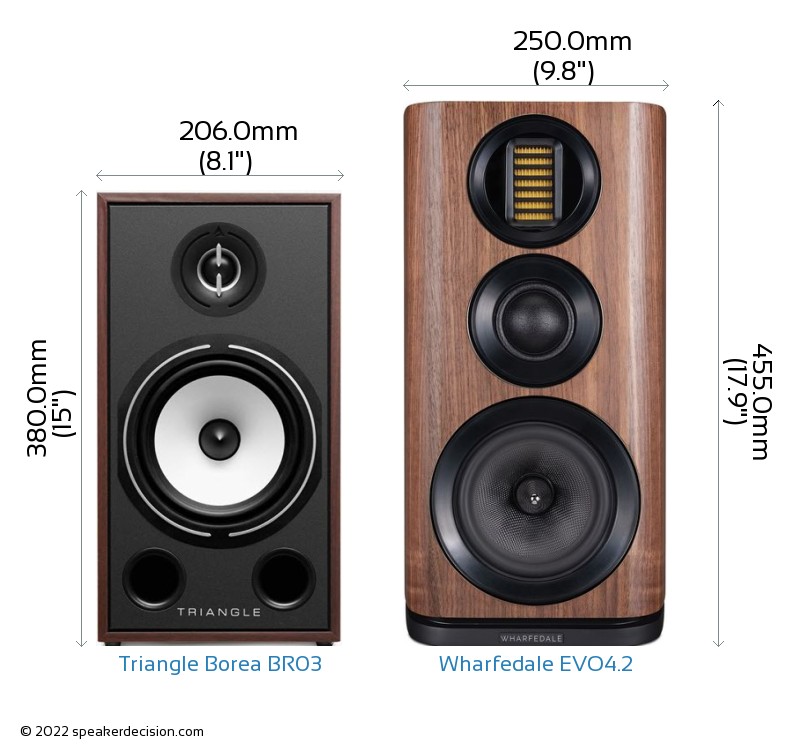 Size of a speaker can sometimes become an important decision factor due to space constraints or in some cases purely for esthetic reasons. In this section, we are going to compare Triangle Borea BR03's and Wharfedale EVO4.2's external dimensions. Triangle Borea BR03 has external dimensions of 380.0 x 206.0 x 314.0mm ( 14.9 x 8.1 x 12.3inch) whereas Wharfedale EVO4.2 has external dimensions of 455.0 x 250.0 x 350.0mm ( 17.9 x 9.8 x 13.7inch) .