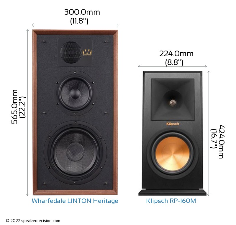 Wharfedale LINTON is clearly the larger of the two speakers. Its body is 76mm wider, 141mm taller and 33mm deeper than Klipsch RP-160M.